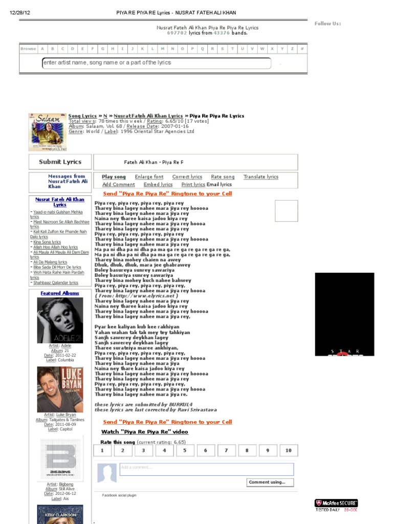 Piya Re Piya Re Nusrat Fateh Ali Khan / His musical projects with peter gabriel introduced qawwali to the western audiences, in which he experimented with blending eastern sounds over western instruments.