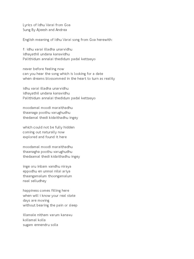 Idhu Varai Song Lyrics In Goa Love Song Lyrics Whatsapp Status Tamil Panda Tamil Youtube Vaarai vaarai lyrics in voice of shreya ghoshal & shankar mahadevan is a beautiful tamil song from bogan film starring jayam ravi & hansika motwani.karky is writer of the track produced by d.
